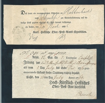 "Cassel", 1768, "hoch-Fürstlich-hessisches Ober-Post-Amt hierselbst", früher Ortsdruck-Zeitungsschein, dazu zweiter Zeitungsschein 1836 "kurf. hessische Ober-Post-Amts-Expedition"