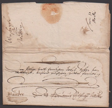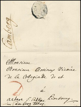 "Camberg", 1738, früher hs. rs. Aufgabevermerk auf Brief mit Inhalt aus Coblentz, über einen "Botm." Lothar im Camberg gemäß vs. Vermerk nach Limburg gelaufen