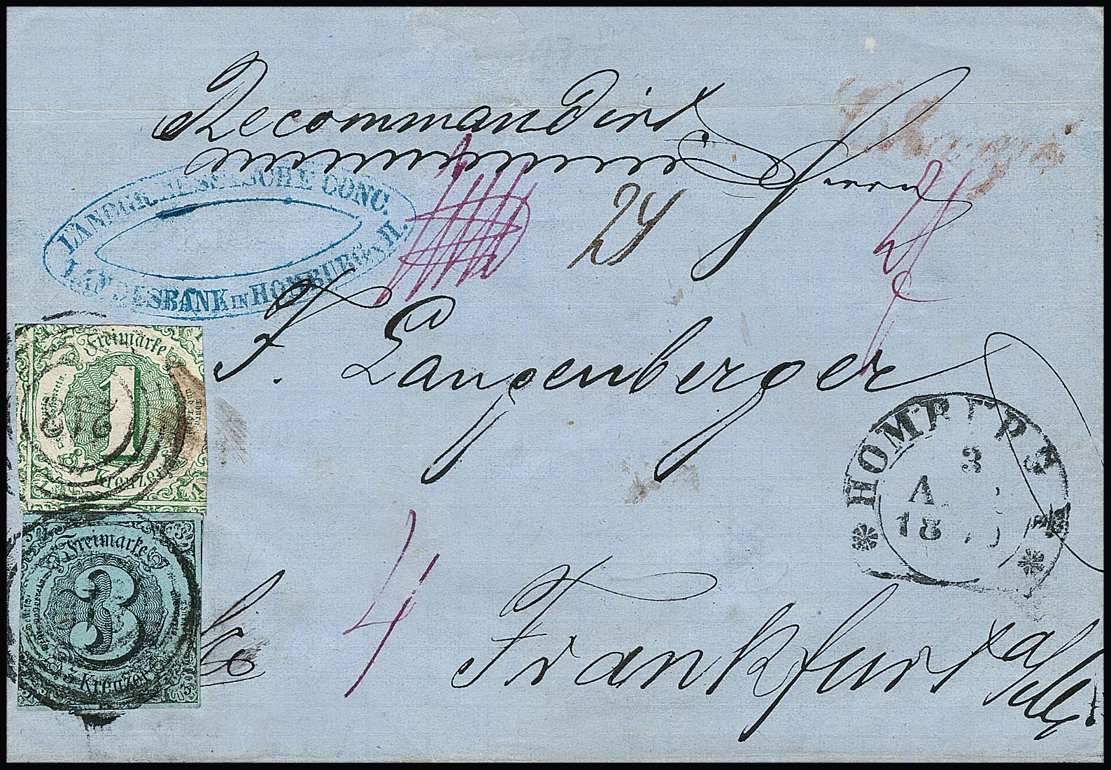 "218" nebst HK "Homburg" auf Nahbereichs-Chargébrief der 2. Gewichtsstufe mit üblich geschnittenen 3 und 1 Kr., Gebrauchserhaltung