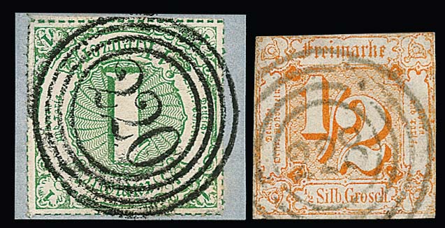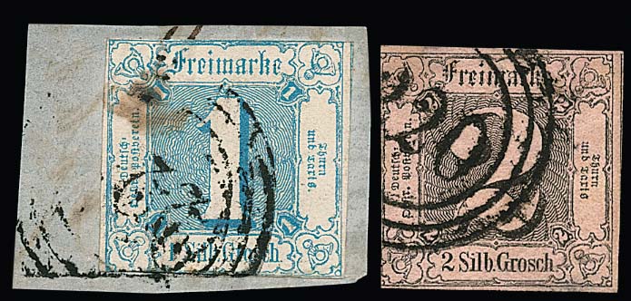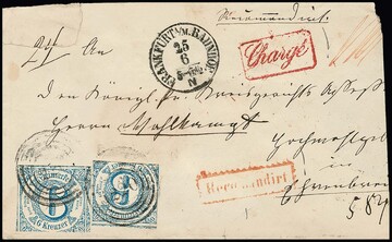 "220" (Frankfurt) als ungewöhnliche Währungs-Fremdentwertungen auf 2 Sgr., 1. Ausgabe, und Briefstück 1 Sgr. blau, (kl.) Mängel, aber ungewöhnliche Verwendungen von Silbergroschen-Marken im Kreuzerbereich. Sign. bzw. Fotoexp. Sem