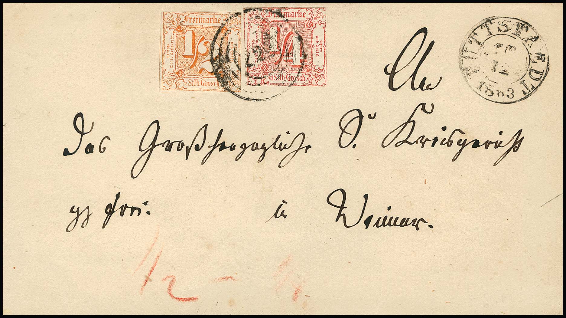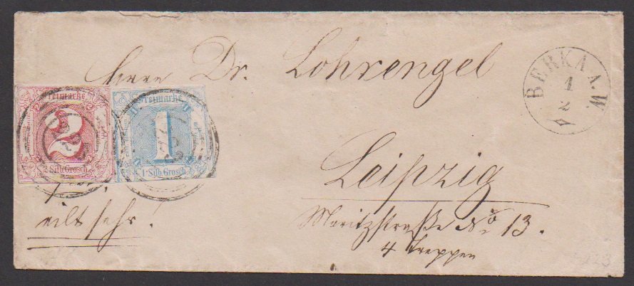 "227", für diesen Ort typisch unklar, nebst Fingerhut-K1 "Buttelstedt", auf Faltbrief mit 1/4 und 1/2 Sgr. (letztere min. Knitter), auf Brief seltener Nummernstempel