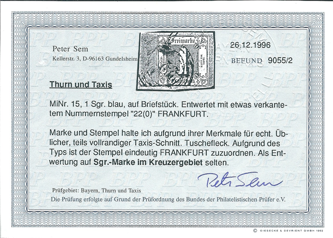 "220" (Frankfurt) in blau klar auf 9 Kr., 1. Ausgabe (kl. Mgl.), sign. Sem