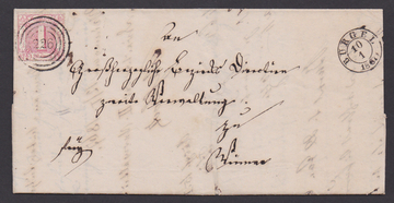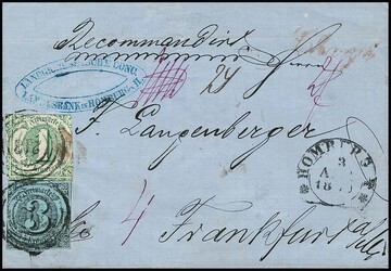 "220" (Bahnhofstype) nebst K1 "Frankfurt Bahnhof" auf fünf Briefen inkl. 9 Kr. gelborange (kl. Mgl.), sowie üblich geschnittene 6 und 9 Kr. auf Reco-Couvert nach Mähren, ferner auf etwas verkürztem Reco-Brief mit 6 Kr. blau per zwei