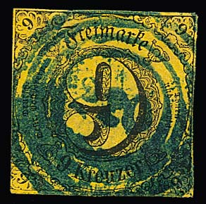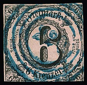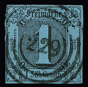 "220" von Frankfurt in seltener blauer Farbe klar auf normal geschnittener 6 Kr., erste Ausgabe