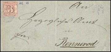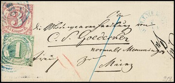"212" nebst K1 "Wallmerod", je in blau (selten!), auf Brief mit dreiseitig vollrandiger 3 Kr. rot, Fotoexp. Sem