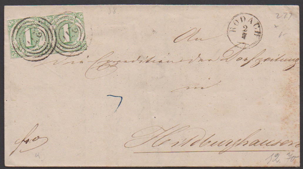 "277" nebst K1 "Rodach" klar auf Brief mit Paar 1 Kr. (linke Marke tadellos), Brief rechts am Rand kl. Pünktchen