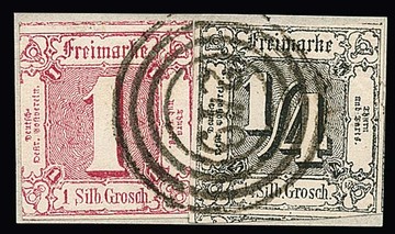 "249" (Vieselbach) klar und zentrisch auf Briefstück mit voll- bis breitrandigem Kabinettstück 1/4 Sgr. schwarz nebst üblich geschnittener 1 Sgr. rot, sign. Kruschel
