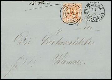 "243" nebst K2 "Stadtremda", je in seltener blauer Farbe, klar auf Brief mit breitrandiger 3 Sgr. schw./gelb (Bugspur), Fotoexp. Sem. Feuser + 1000,-