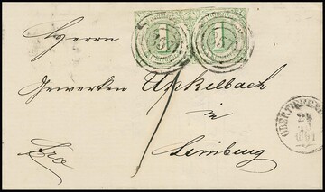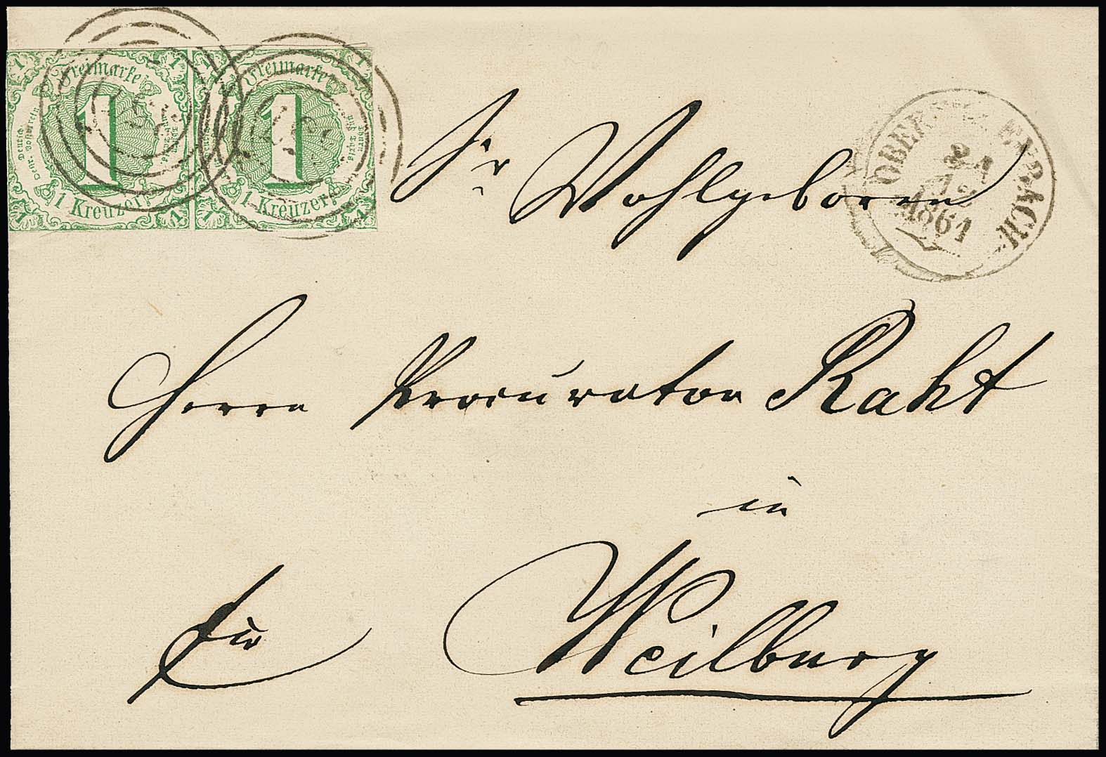 "357" nebst K1 "Obertiefenbach" auf zwei Briefen je mit Paaren 1 Kr. grün aus gleicher Korrespondenz 1861 nach Limburg
