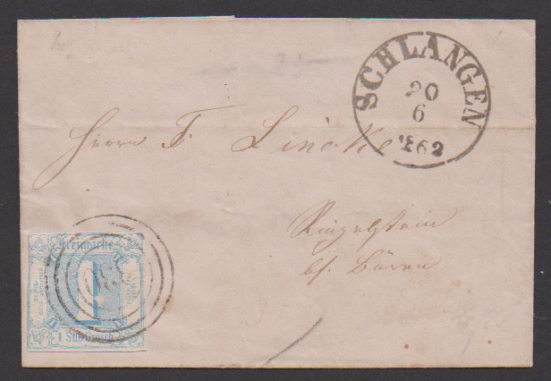 "330" nebst K1 "Schlangen" klar auf kleinem Briefchen mit normal geschnittener 1 Sgr. hellblau