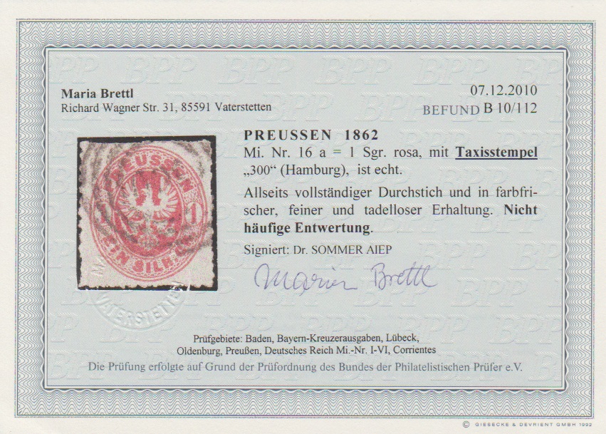 "300" von Hamburg als seltene Fremdentwertung auf Preußen 1 Sgr., sign. Sommer und Fotoexp. Brettl "allseits vollständiger Durchstich und in farbfrischer, feiner und tadelloser Erhaltung"