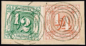 "326" (Oerlinghausen) ideal auf dekorativem Briefstück mit 1/4 Sgr. rotorange (kl. Vortrennschnitt) und 1/2 Sgr. grün vom Rand, gut sign. Brettl
