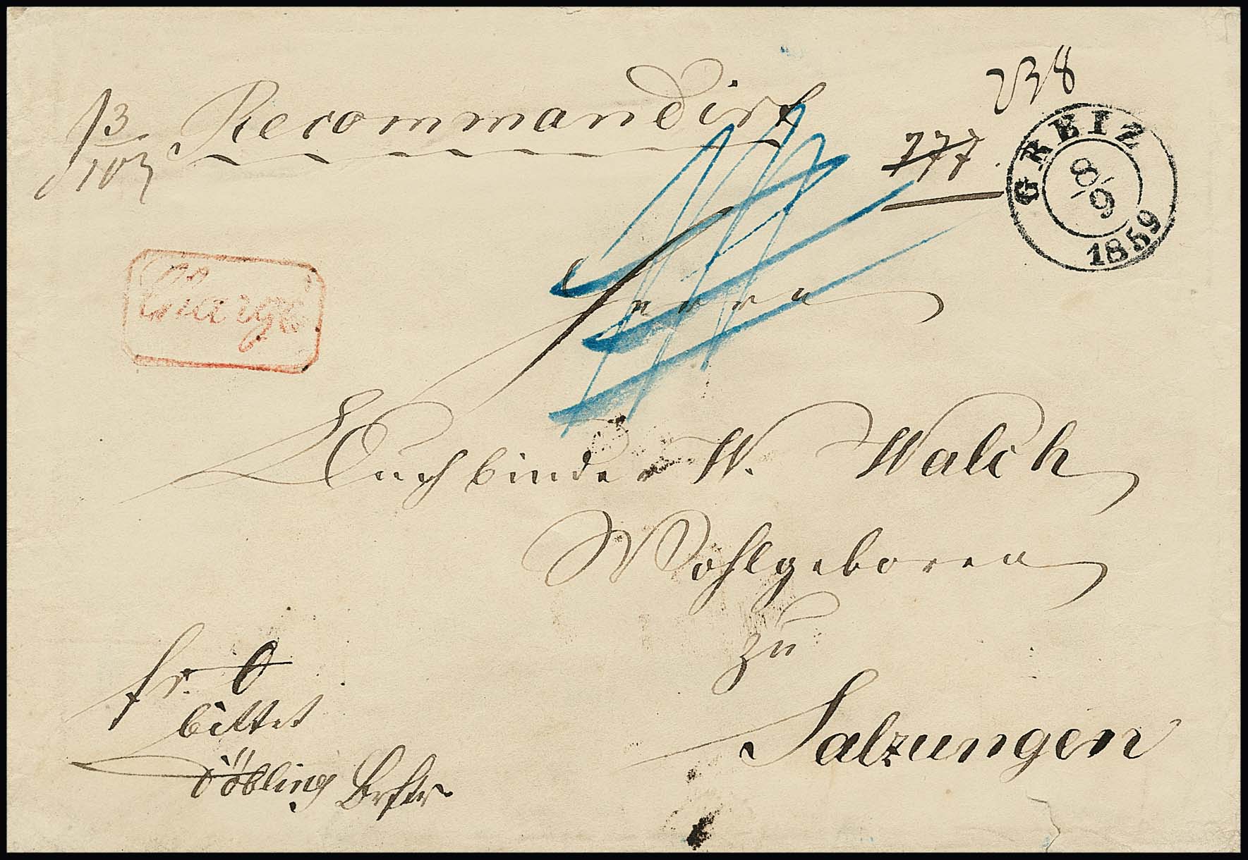 "Greiz", 1859, K2 auf Chargébrief nach Salzungen (leichte Gebrauchsspuren), der Absender, Postbeamter Dölling, hatte lt. Vermerk "fr. 0" Portofreiheit, lediglich die Chargégebühr musste bezahlt werden