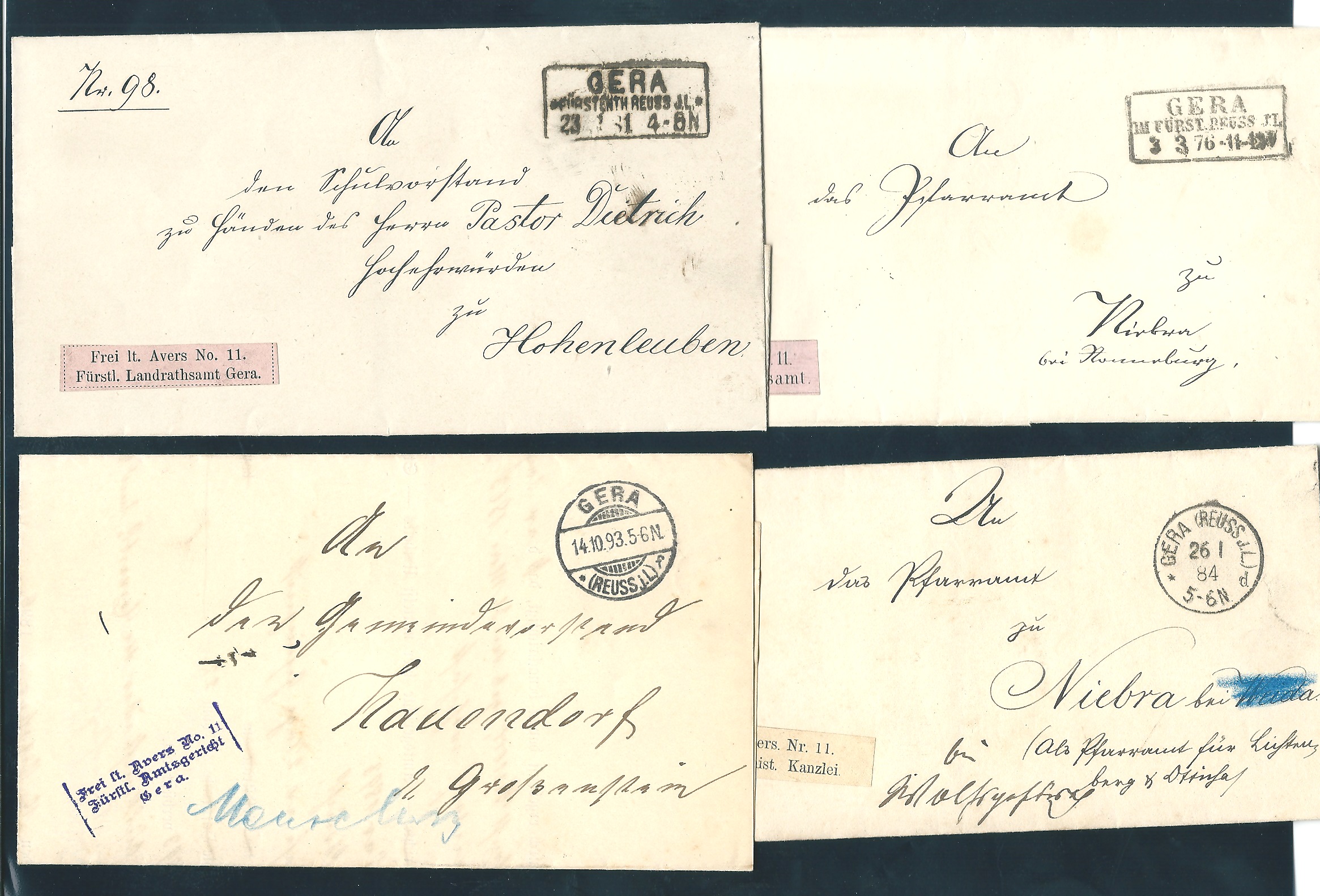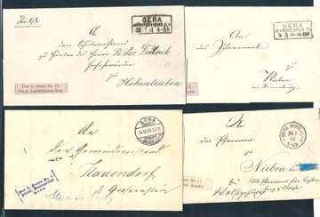 "Gera", 1876-1893, vier portofreie Dienstbriefe, davon drei mit versch. Averszeichen und einer mit Aversstempel