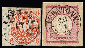 "Gräfentonna-Herbsleben", der seltene nachverw. Postablage-K1 auf Briefstück Preußen 6 Pfge. (kl. Eckfehler, gut sign. Haferkamp), ferner der normale nachverw. K1 auf Brief 1 Gr. NDP und zwei Brustschild-Briefstücken