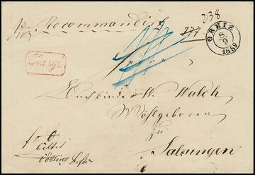 "Gera", 1854, K1 auf seltenem recommandiertem Portobrief nach Langensalza (nur bis 31.12.1860 zulässig), 4 Sgr. Briefporto in der 2. Gewichtsstufe, Chargégebühr bar bezahlt