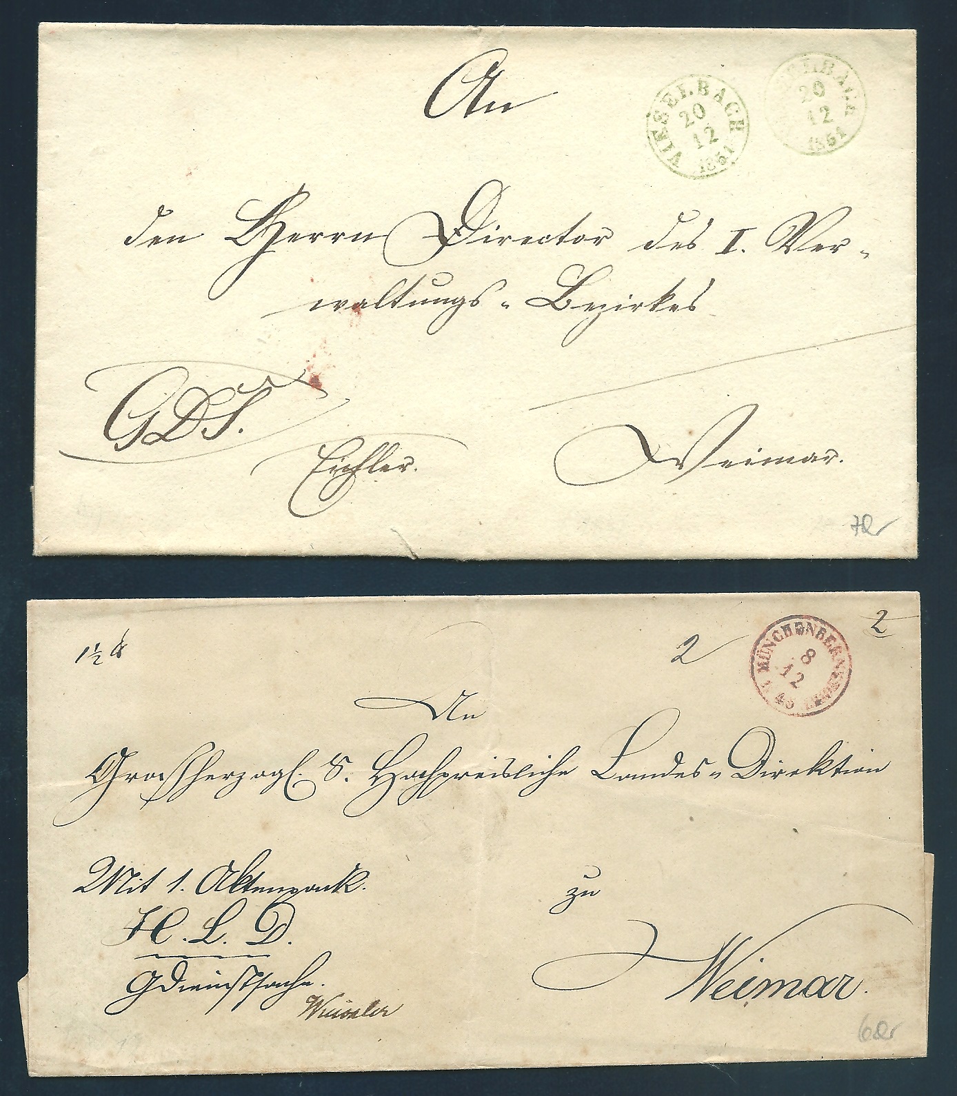 "Münchenbernsdorf", roter K1 1849, "Vieselbach" in grün 1851, zwei Briefe mit besseren Fingerhut-K1