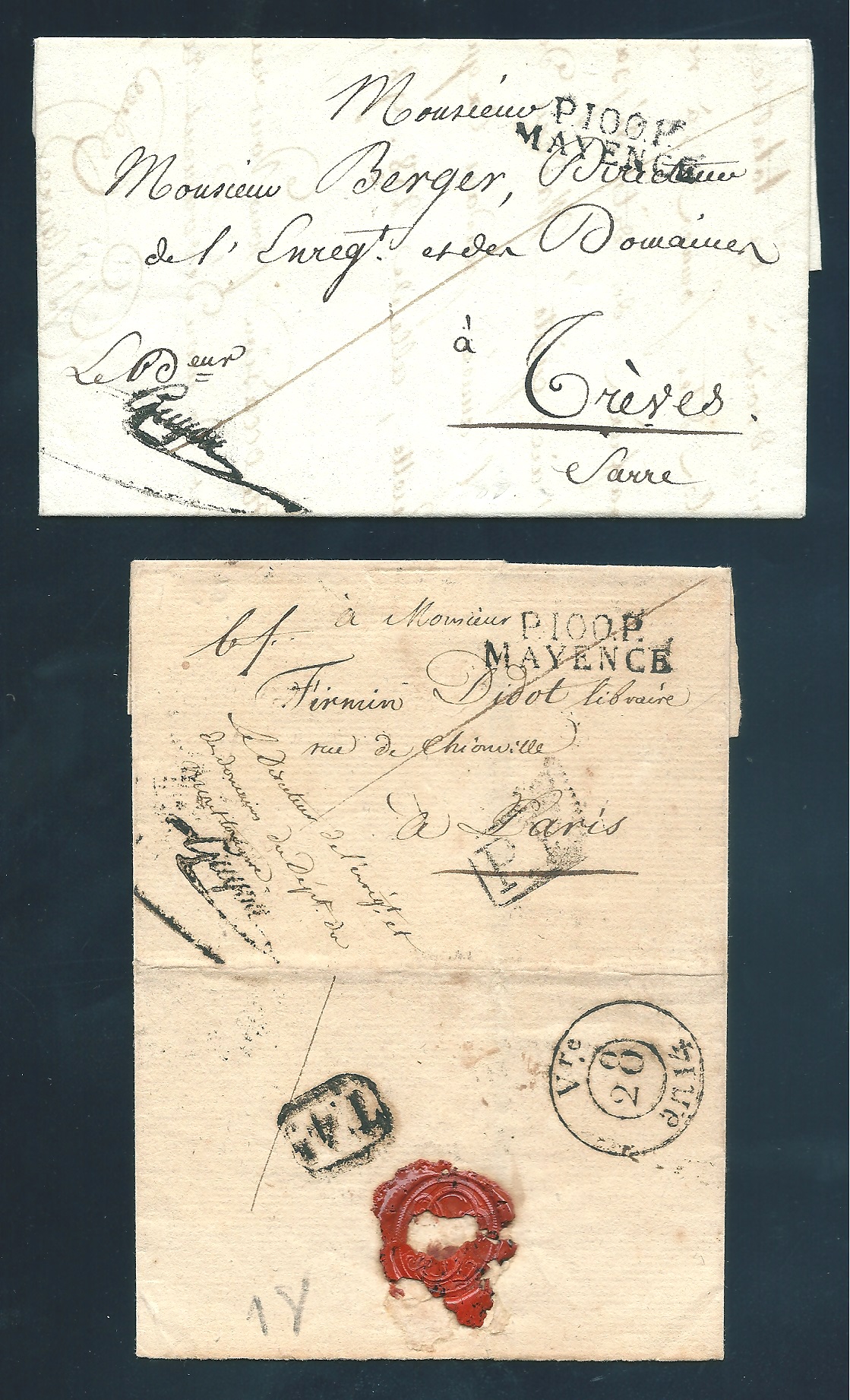 "Mainz", 1811, je L2 "P.100.P. MAYENCE" nebst Franchise-Stempel "SUYON" auf zwei Briefen