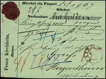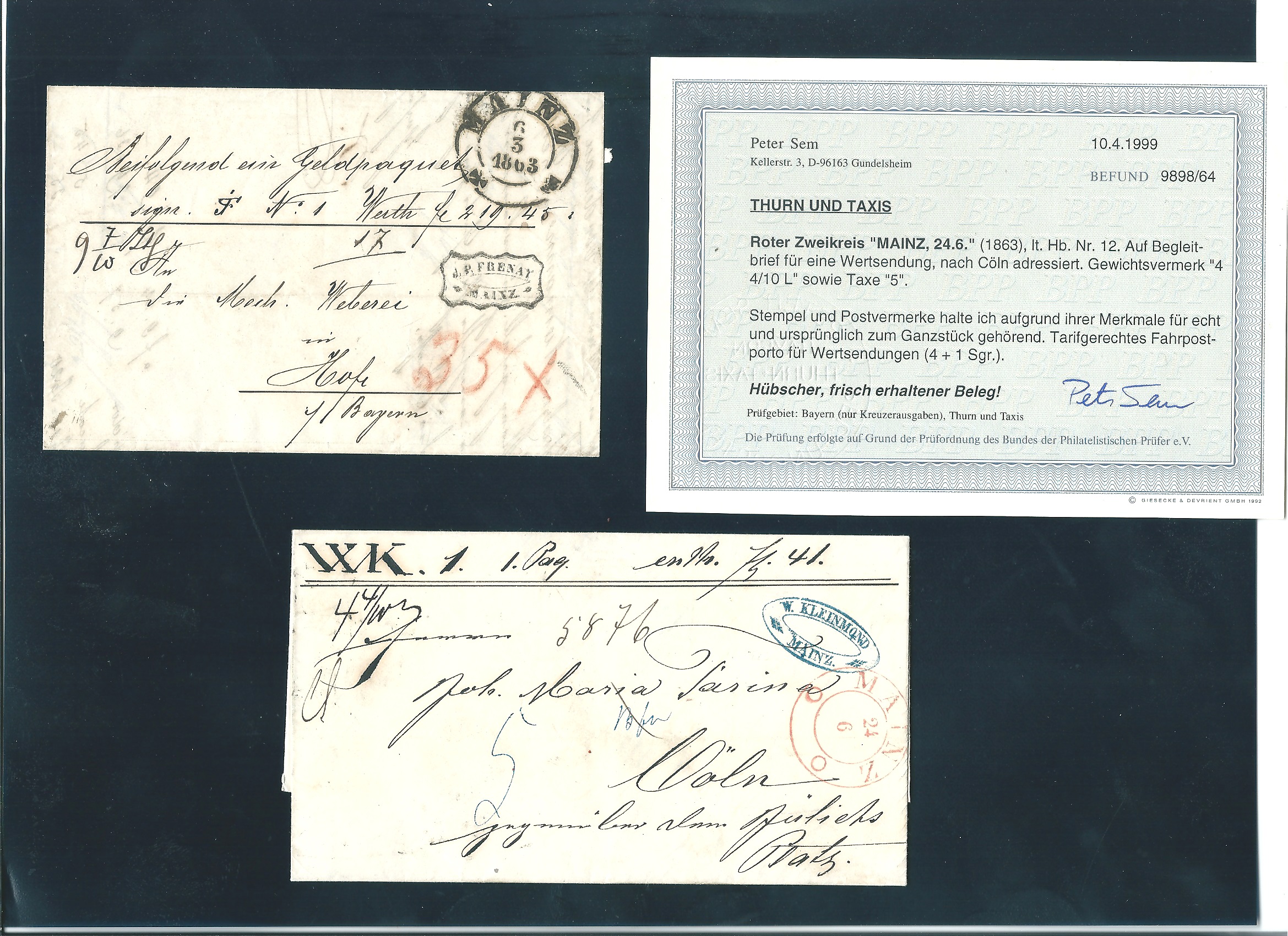 "Mainz", 1863, schwarzer K2 (mit Kreuzen) bzw. roter K2 (mit Ringen), zwei dekorative Paketbriefe (ein Befund Sem)
