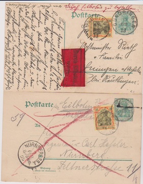 2 und 2 1/2 Pfg. Germania je auf zwei versch. Ganzsachenkarten 5 1/2 Pfg., 1919, von Bopfingen nach Ulm, und Herrlingen als Doppelkarte nach Zürich