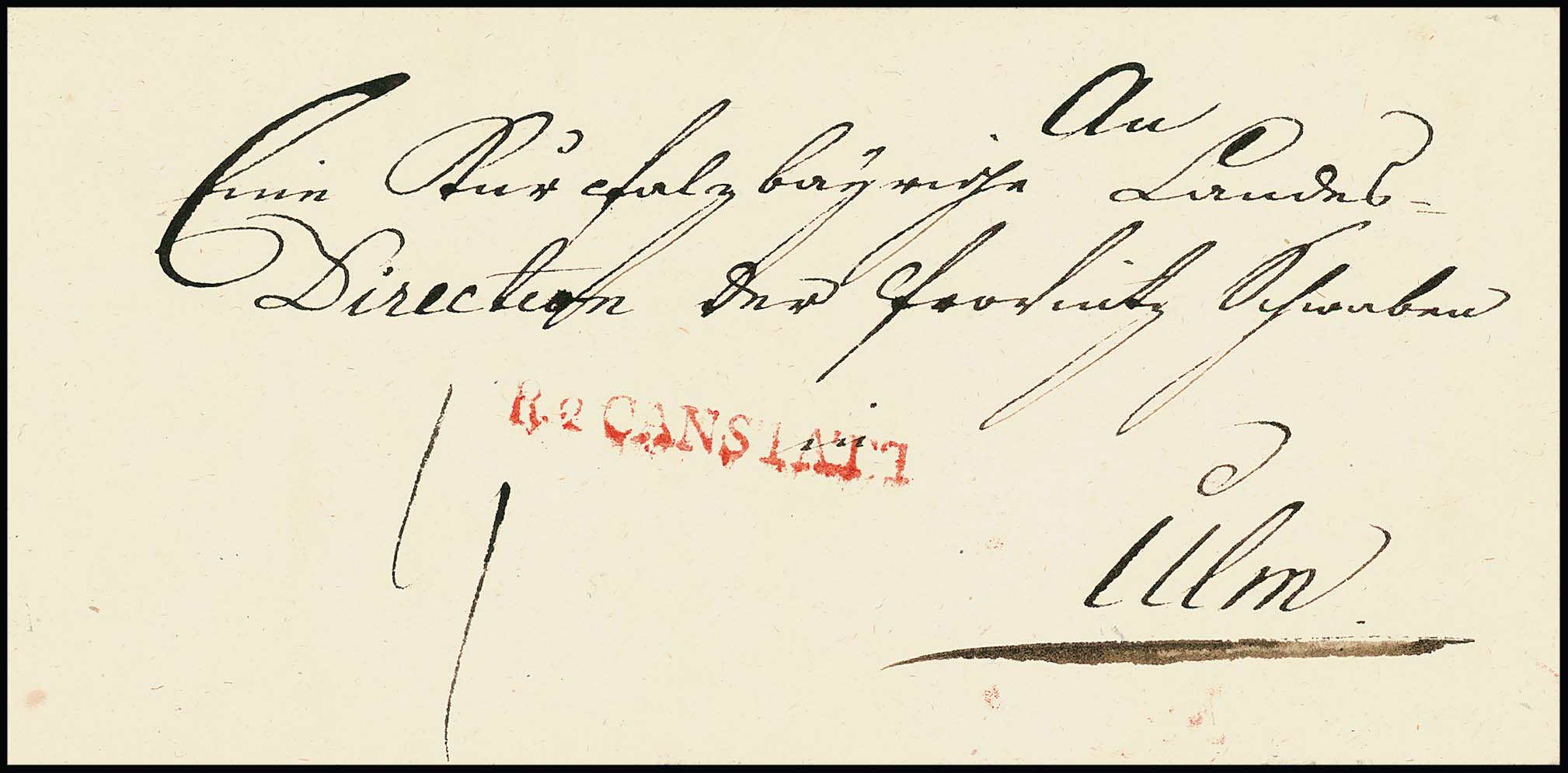 "Cannstatt", (1803), klarer orangeroter L1 "R.2. CANSTATT", gerade Type, auf Kabinettbrief (Hülle) nach Ulm, seltener und schöner Brief, Feuser 555-3, 1000,-