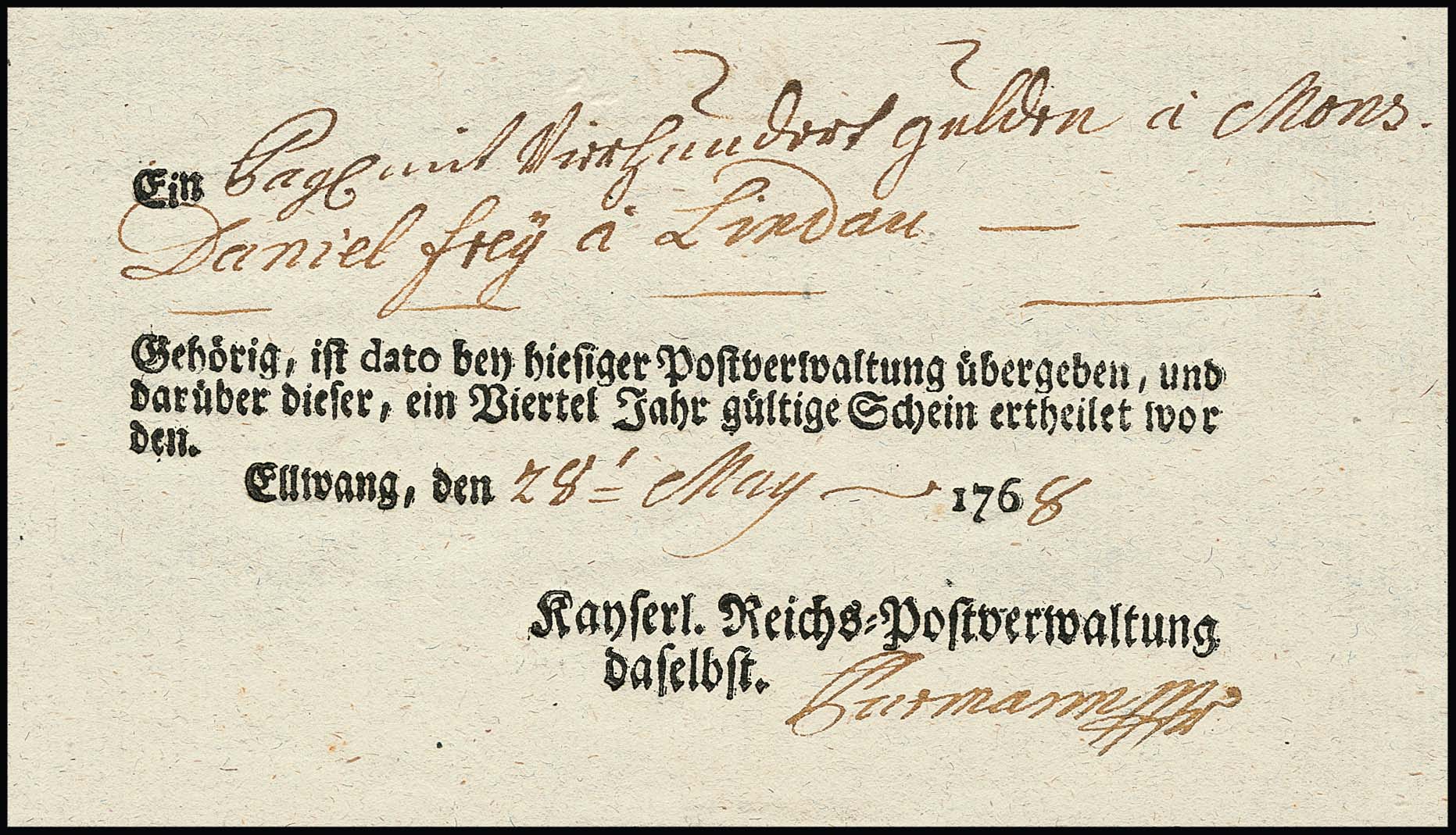 "Ellwangen", 1788, ("Ellwang"), Ortsdruck-Postschein "Kayserl. Reichs-Postverwaltung daselbst", Hb. K01 (nicht gelistet)