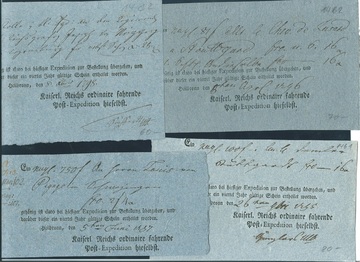 "Heilbronn", 1754-1761, "Postwagen-Expedition zur Rosen", "Fahrender Post dahier", acht hs. Post-Einlieferungsscheine