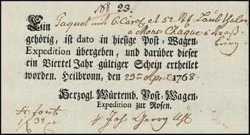 "Heilbronn", 1768, "Herzogl. Würtemb. Post-Wagen-Expedition zur Rosen", typografisch schöner Ortsdruck-Postschein (dazu hs. "Rosen"-Schein aus 1755), Hb. L2