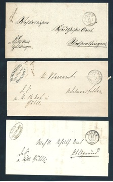 "Hüttlingen" (Aalen bzw. Wasseralfingen), zweimal der Postablage-Stempel, sowie einmal hs. "HÜTTLINGEN" nebst K3 "AALEN", auf drei Kabinettbriefen