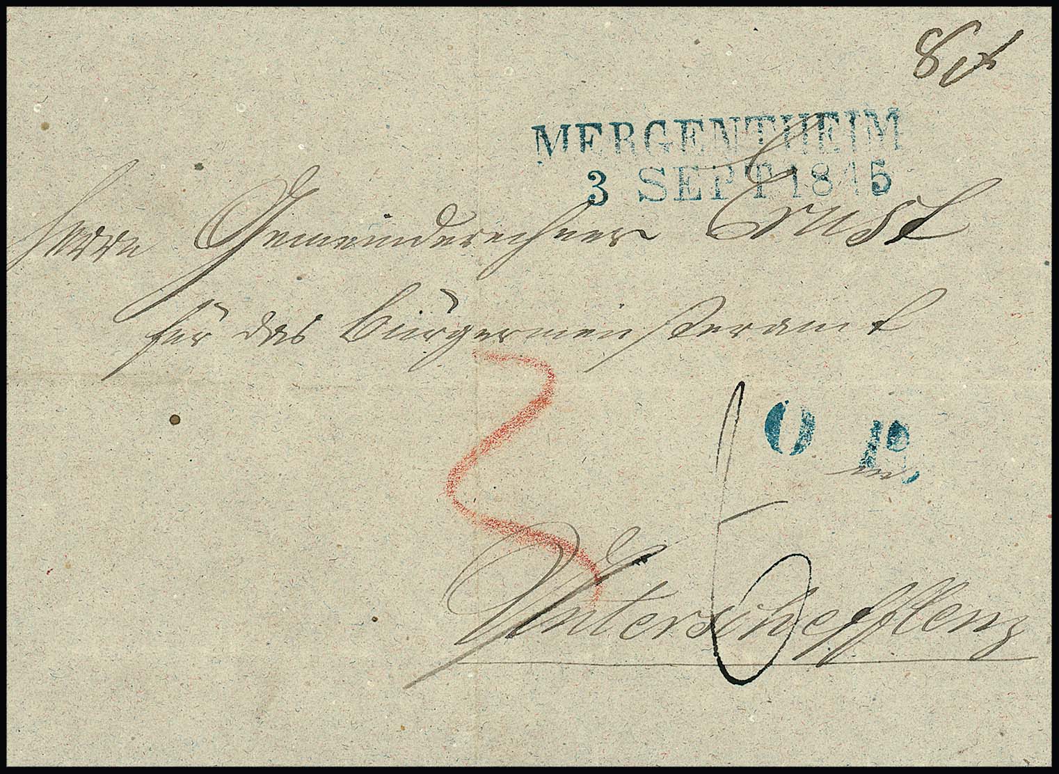 "Mergentheim", blauer L2 nebst blauem L1 "O.P." (= Ostpreußen) auf Brief 1845 nach Unterschefflenz, interessanter Stempelirrtum