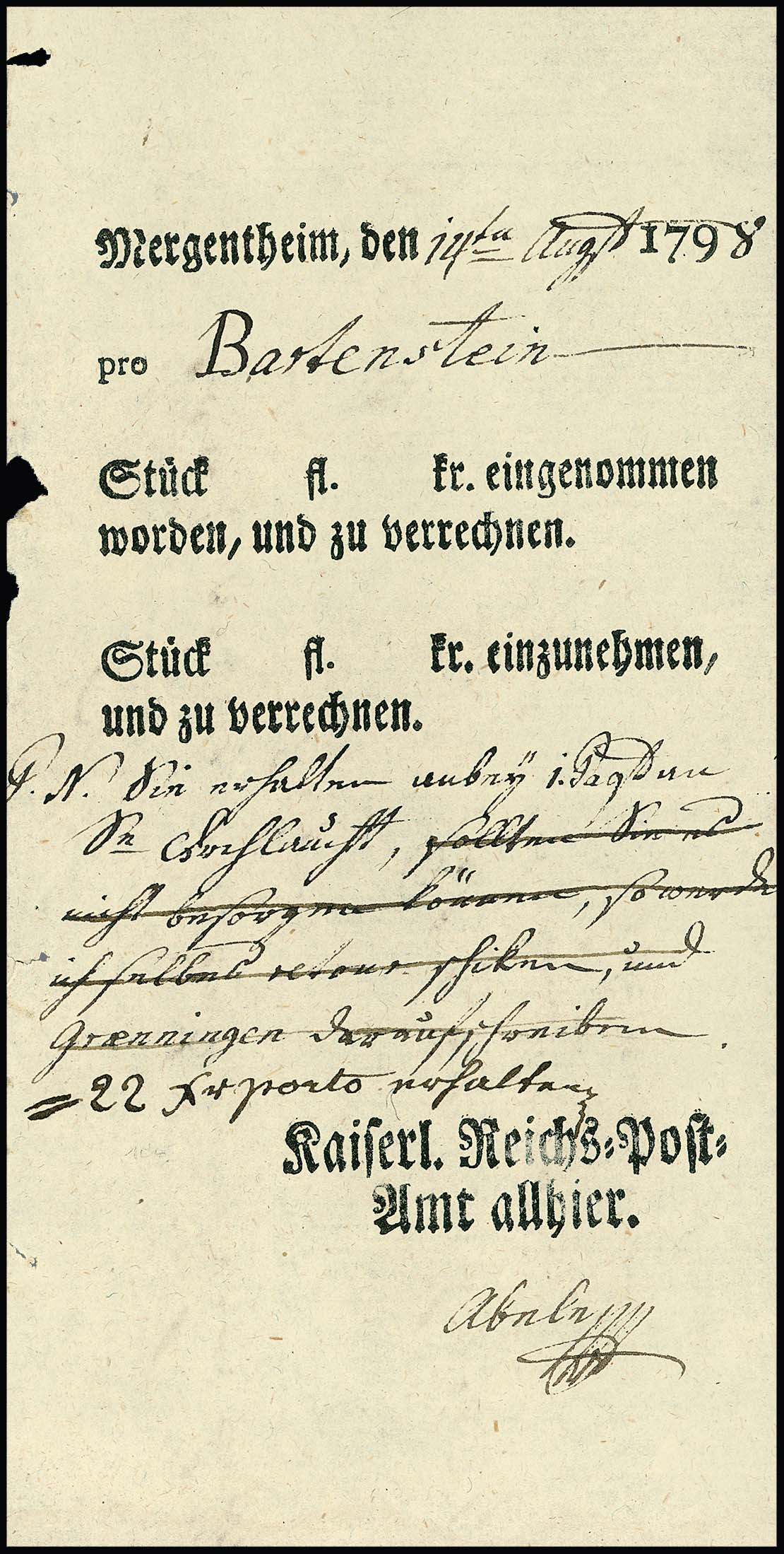 "Mergentheim", 1798, seltene "Post Correspondenz", "Kaiserl. Reichs-Post-Amt allhier" an den Postmeister von Bartenstein über 22 Kreuzer
