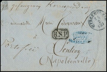 "Mergentheim", 1871, K1 auf portofreiem, links etwas verkürztem Kriegsgefangenen-Couvert mit Inhalt nach Frankreich, vs. und rs. seltener blauer Ovalstempel "Feldpost Kommando des Württemb. Jägerbatls.", dopp. sign. Kruschel