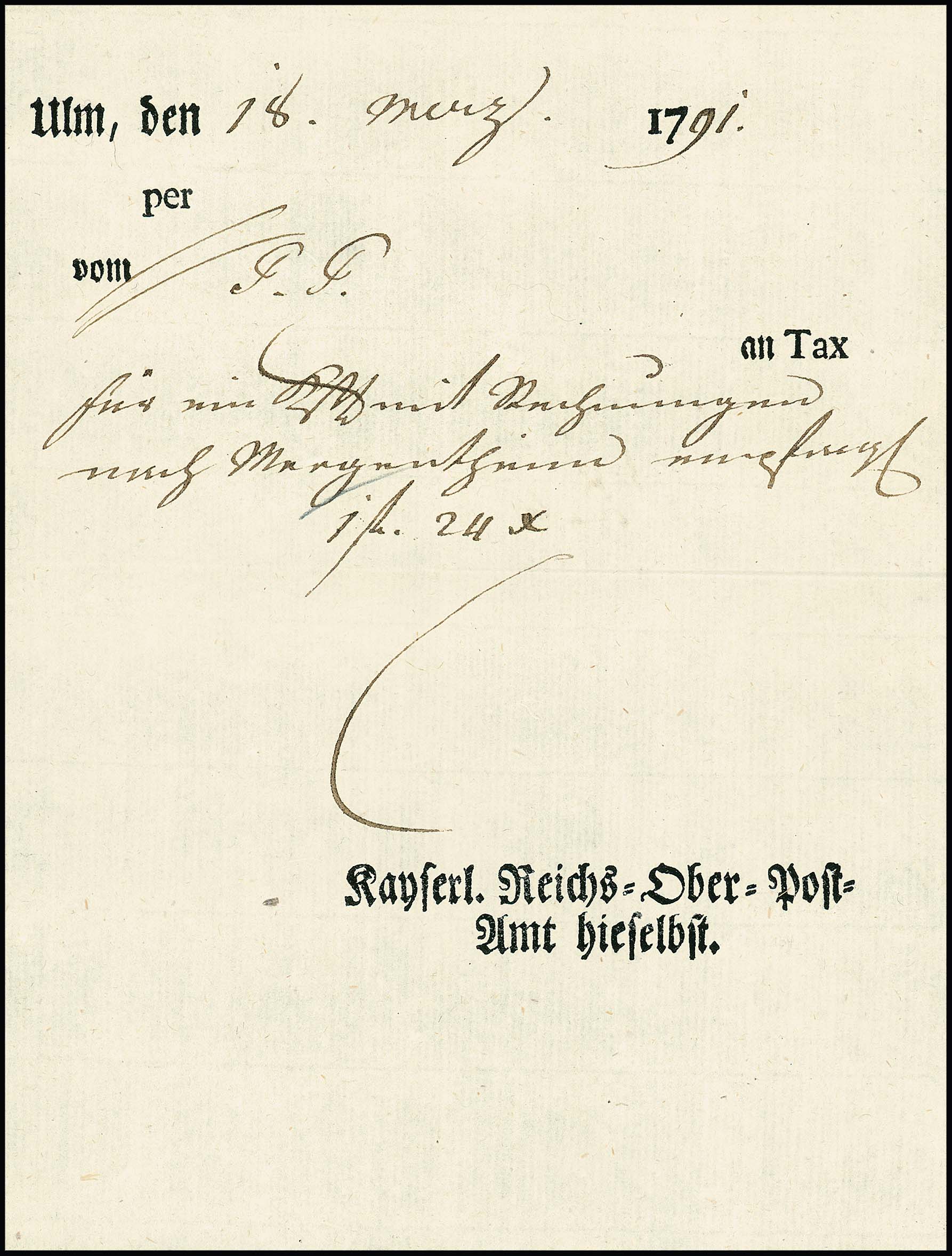 "Ulm", 1791, "Kayserl. Reichs-Ober-Post-Amt hieselbst", seltenes "Postcharten"-Formular als Gebührenquittung für eine Kiste