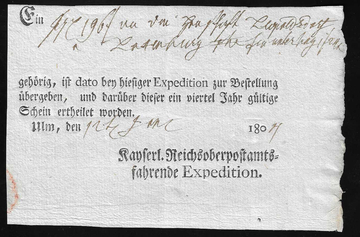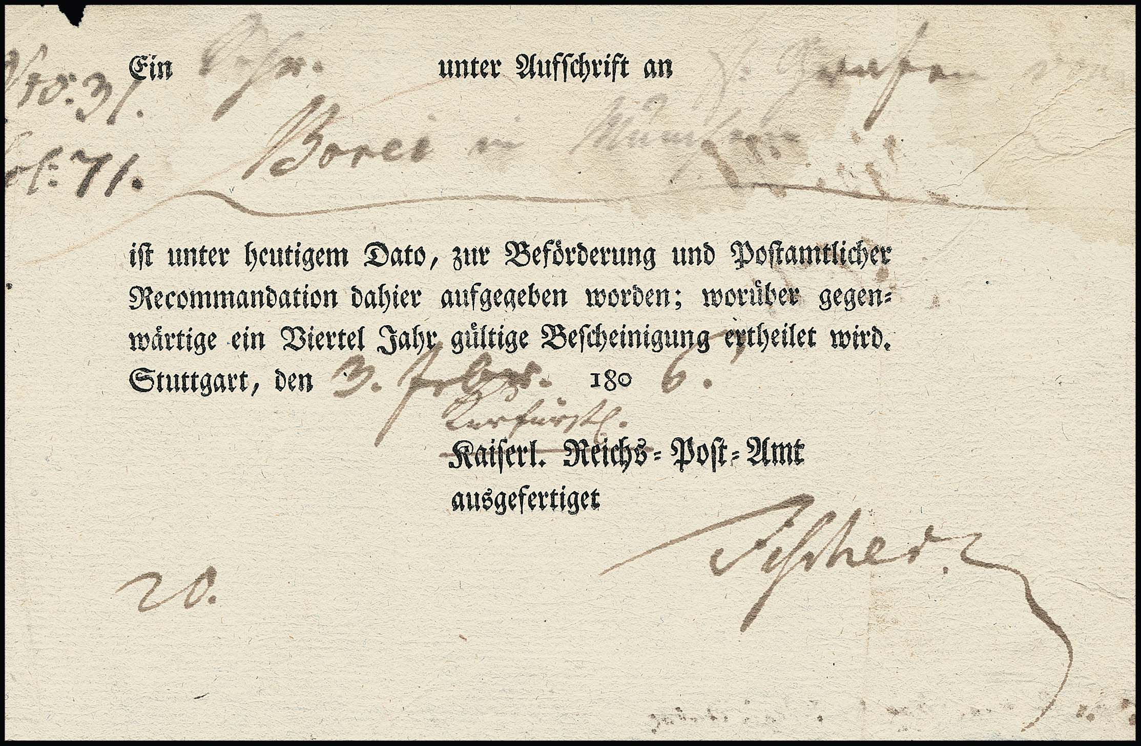"Stuttgart", 1806, "Kaiserl. Reichs-Post-Amt" (geändert in "Kurfürstl."), sehr seltener Reco-Ortsdruck-Postschein (etwas wasserfleckig)