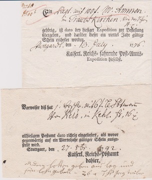 "Stuttgart", 1779-1804, fünf Ortsdruck-Reichspostscheine