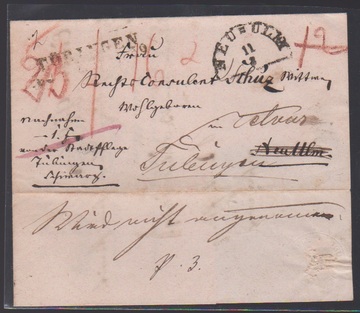 "Stuttgart", (1802), seltener kursiver Fahrpost-L1 "V. STUTTGARDT" auf Paketbegleitbrief (Hülle) nach Unterriexingen