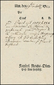 "Ulm", 1780, kleiner Ortsdruck-Einlieferungsschein für ein Wertpaket, "kayserl. Reichs-Ober-Post-Amt hieselbst"