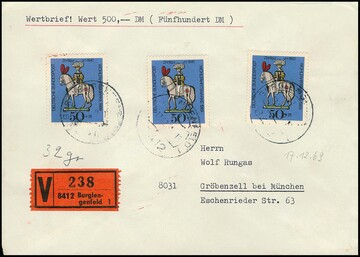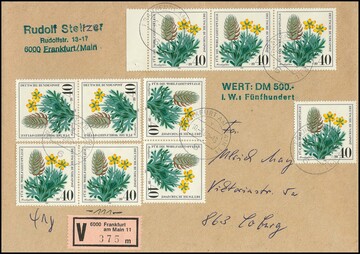 Jahrgänge 1969-1977, acht gute portoger. Mehrfach-Frankaturen: Nr. 581 als MeF per zwei und drei (selten), 588(4), 607(3), 632(5), 698(7), 701(4) und 918 (4, Bogenrand-VB)