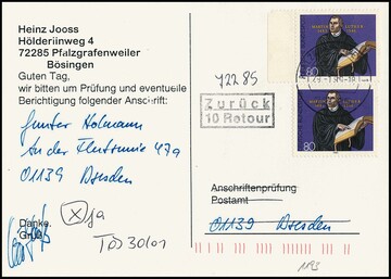 200 u. 500 Pfg. Industrie u. Technik, je rechte untere Bogenecken mit Formnummern "2" auf Wertbrief aus Lindow 1992