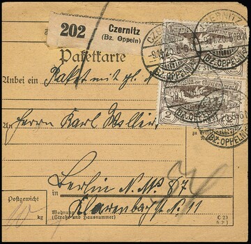 2 Mk. im Paar (ein Wert etwas bestoßen durch Randklebung) als gute Mehrfach-Frankatur auf Bedarfs-Paketkarte aus Czernitz 1920