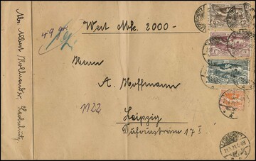 40 u. 50 Pfg. nebst 1 und 2 Mk. zusammen auf Bedarfs-Wertbrief (Gebrauchsspuren wie Falten ausserhalb) von Leobschütz, 21.6.21, nach Leipzig