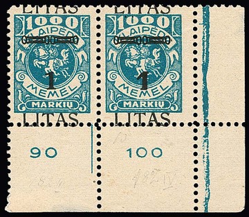 1 C. a. 1000 M. im postfrischen Typen-Mischpaar III/IV (aus der rechten unteren Bogenecke, nur im Rand Anhaftungen), Mi. 2600,-