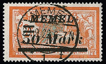 50 M. a. 2 Fr., Aufdruckfehler "Abstand zwischen 50 und Mark 3,2 statt 2,8mm" zentr. gest., rechts zwei leicht verkürzte Zähne, Fotoexp. Huylmans. Mi. 350,-