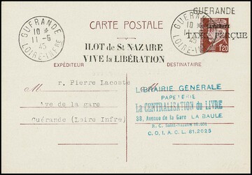 St. Nazaire, Petain-Ganzsachenkarte 1,20 Fr. mit Handstempel "Taxe Percue" und seltenem kopfstehendem "Liberation", nebst L2 "Vive la Liberation", gelaufen aus Guerande, 11.5.45, sign. Tust