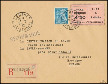 St. Nazaire, 4,50 Fr., Gebührenzettel für Einschreiben, nebst 50 C. (Nr. 560), auf tadellosem R-Brief aus Guerande, Attest Pieles. Mi. 500,-