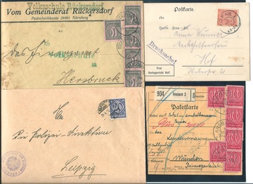 Vier bessere Belege: Nr. 19a und 30 je Einzelfrankatur (Mi. 155,-), 68b per fünf als MeF (182,-), sowie Nr. 74 per 23 auf Paketkarte (ca. 50,- ++), alle sign. Infla