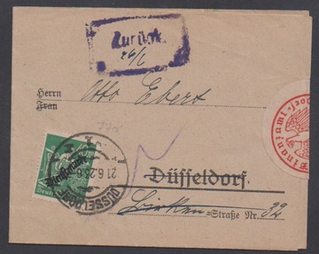 40 Mk. als EF auf Retour-Ortsbrief aus Düsseldorf, 21.6.23, sign. Infla