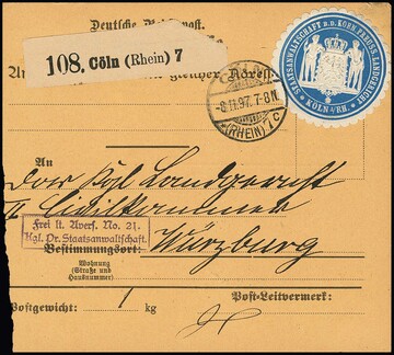 1895/97, "Frei laut Avers No. 21", zwei portofreie Inlands-Paketkarten, aus Cöln mit Vignette der Staatsanwaltschaft, sowie Königsberg vom Amtsgericht