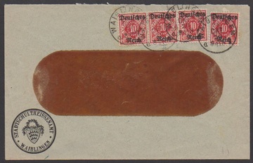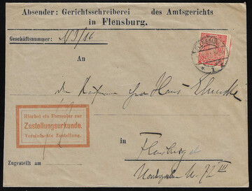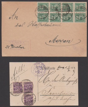 75 Pfg. Ziffern per 40 (zwei 20er-Blöcke) rs. auf Zustell-Urkunde aus Stettin, sign. Infla, ferner Nr. 30 als EF auf Ortsbrief Flensburg, sowie Überdruck-Ausgabe "Wiesbaden" Nr. 14aII auf Bfst.
