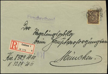 Fünf bessere Einzelfrankaturen: 20 Pfg. früh auf Berliner Ortsbrief vom 3.5.20, Nr. 26 auf Brief aus Altenburg, 30.4.20 (ebenfalls früh), Nr. 30 je einzeln auf Ortsbrief und Drucksache, sowie seltene Einzelfrankatur Nr. 33b auf R-Doppelbrief, sign. Infla (Couvert typische leichte Faltspur)